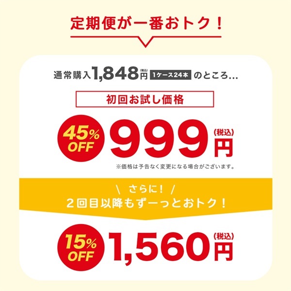 初回のご購入限定 通常購入価格から45%OFFの1ケース999円(税込)でお届けします。※価格は予告なく変更になる場合があります。