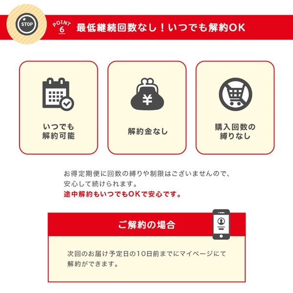 • 「解約」をご希望の場合、お届け予定日の10日前までに「マイページ」にてお手続きができます。